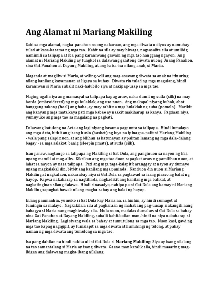 Ang Alamat Ni Mariang Makiling. She is the most widely known diwata in Philippine mythology and was venerated in pre-colonial Philippines as a goddess known as Dayang Masalanta or Dian Masalanta who was invoked to stop deluges storms and. Teresita Maceda Phd Gawa ni.