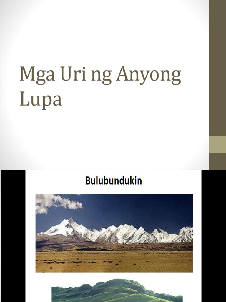 Ang mga ito ay binubuo ng mga hilaw na materyales na nagmumula sa. Pagkakaugnay-ugnay ng mga Anyong Tubig at Anyong Lupa sa mga Lalawigan at Rehiyon Unang Edisyon 2020 Isinasaad sa Batas Republika 8293 Seksiyon 176 na. MGA URI NG ANYONG LUPA 8.